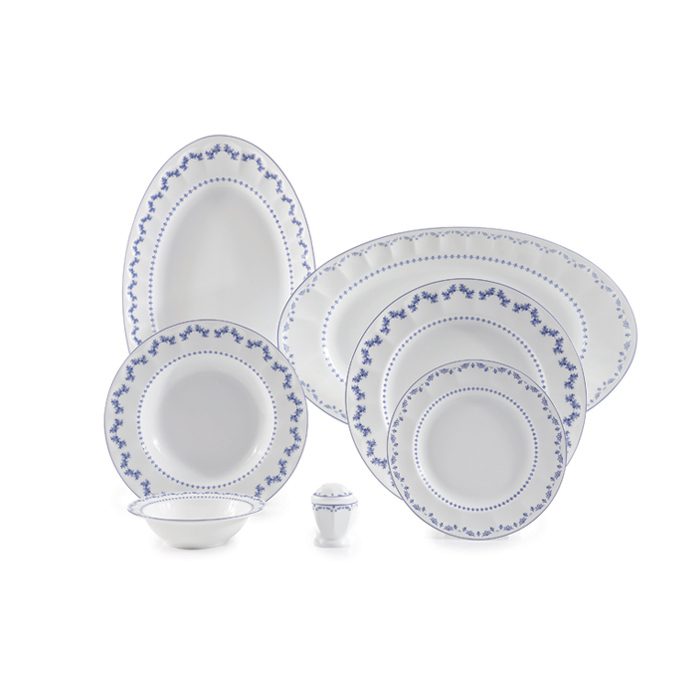 • اقلام : 6 عدد بشقاب برنج خوری _ 6 عدد بشقاب خورشت خوری _ 6 عدد بشقاب میوه خوری _ 6 عدد پیاله ماست خوری _ 1 عدد کاسه سالاد _ 1 عدد دیس بیضی بزرگ _ 1 عدد دیس بیضی کوچک _ 2 عدد نمک پاش